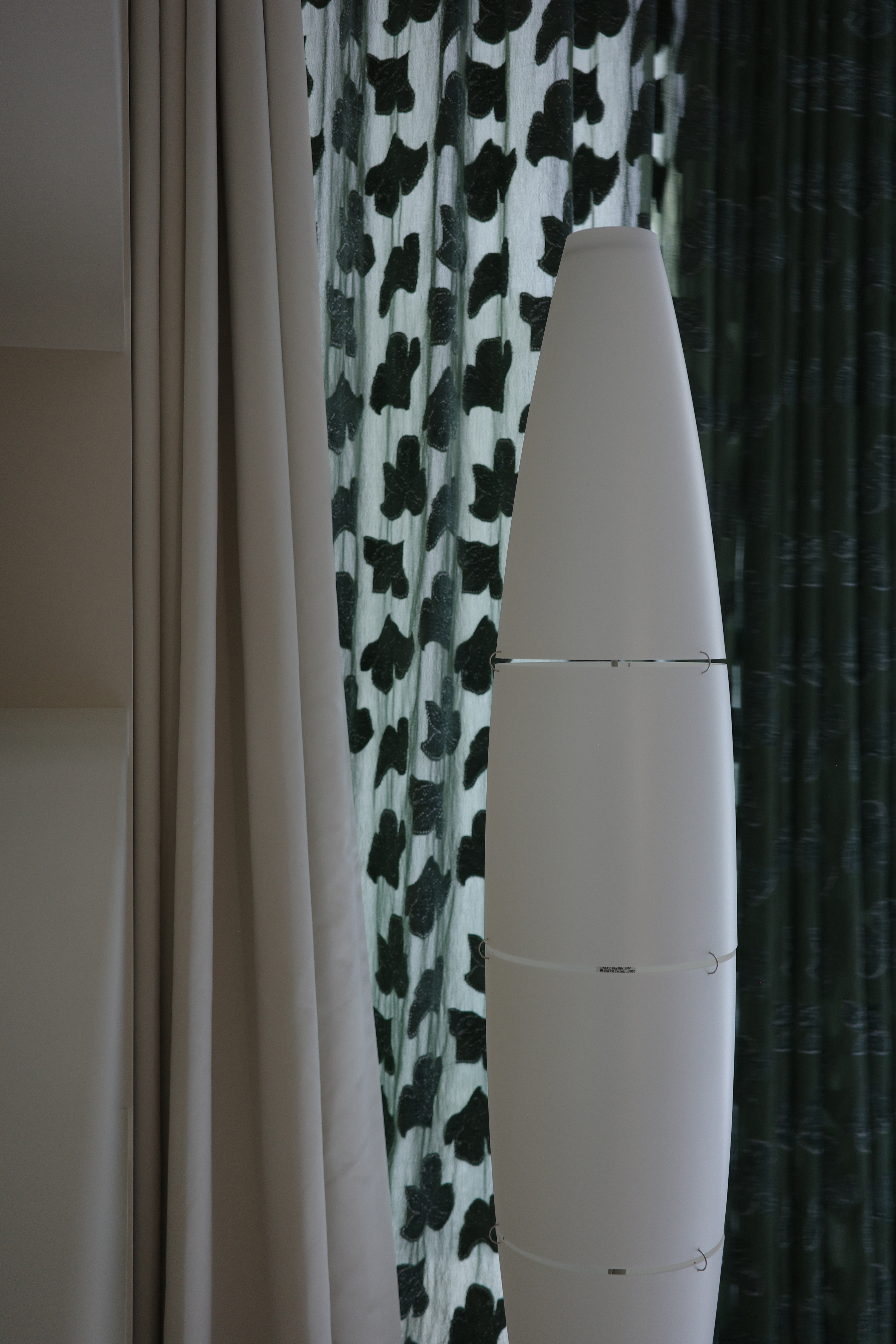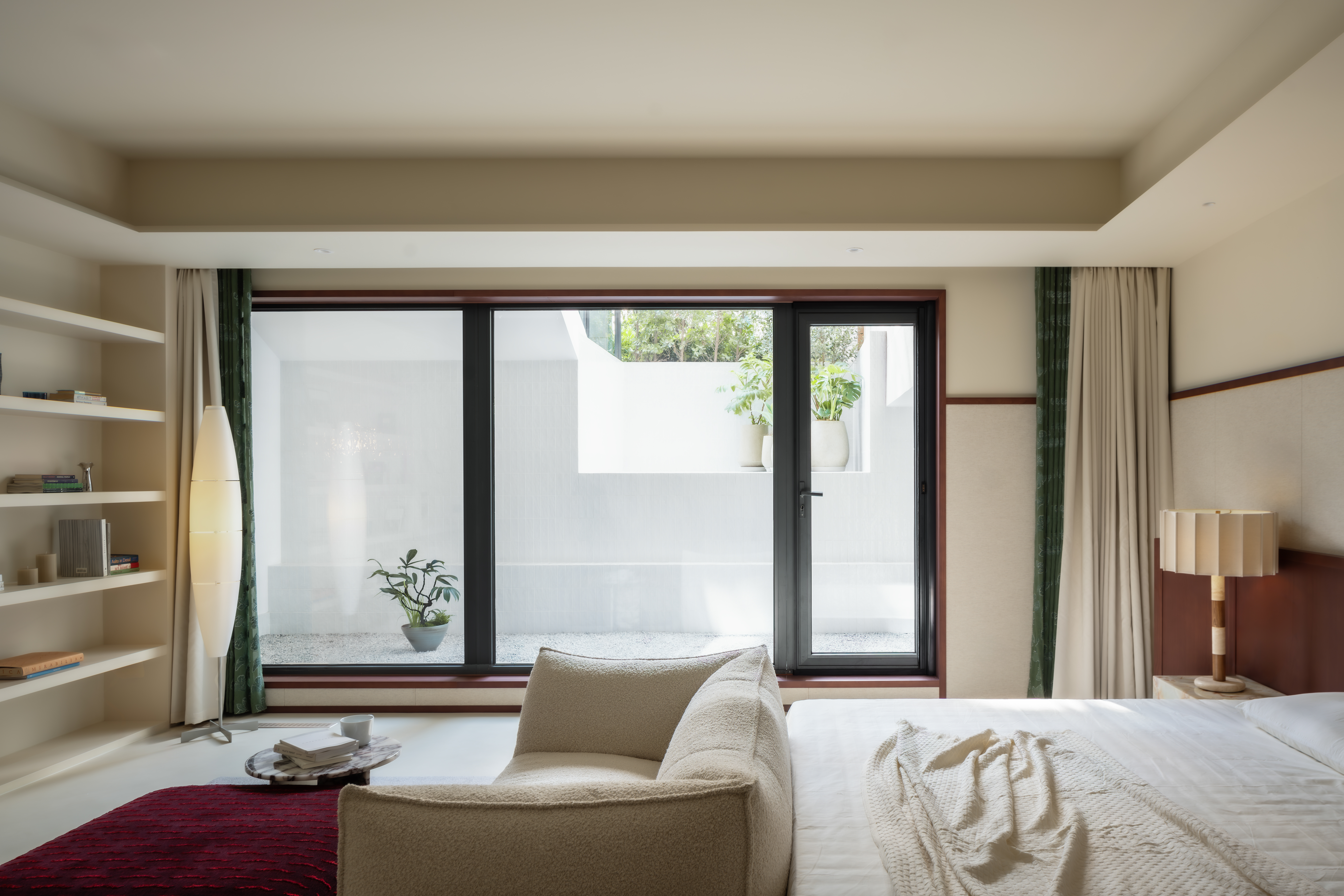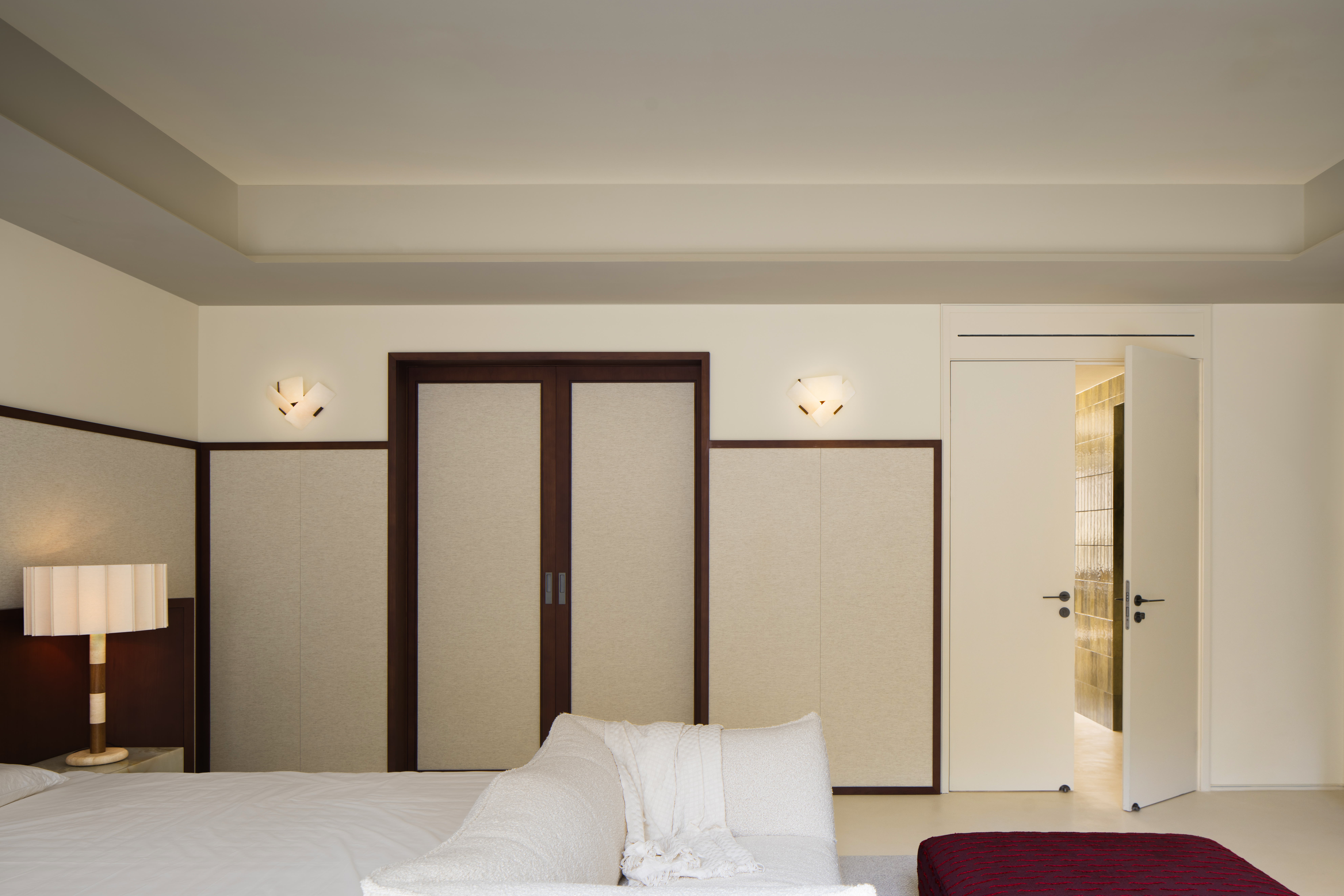 Natural materials and soft furnishings are applied in minimalist forms while simultaneously highlighting geometric rhythms throughout the space. The strategic use of reflective glass and wall surfaces beautifully amplifies natural light from both indoor and outdoor sources, accentuating design details that celebrate a mindful approach to living.